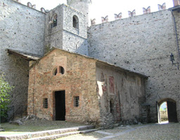Nel cortile del castello si trova la cappella castrense con affreschi del XV secolo; un San Cristoforo posto in facciata è opera di Giacomino d'Ivrea; altri affreschi (tra i quali una Santa Liberata sono all'interno della cappella).
