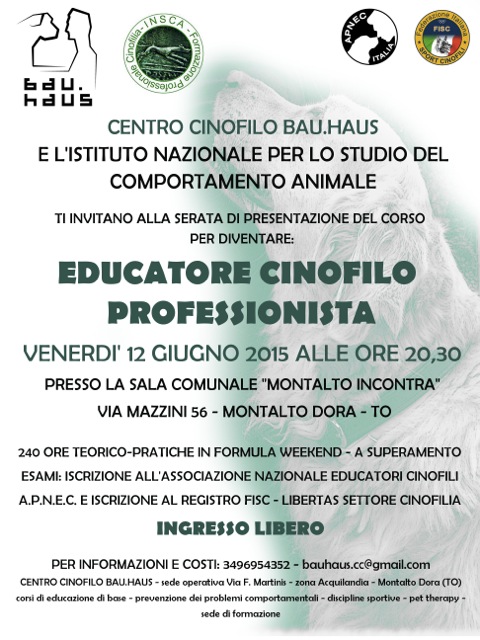 Venerdi 12 giugno 2015 il Centro Cinofilo BAU.HAUS di Montalto Dora organizza una serata di presentazione del corso per la figura da "Educatore Cinofilo Professionista".