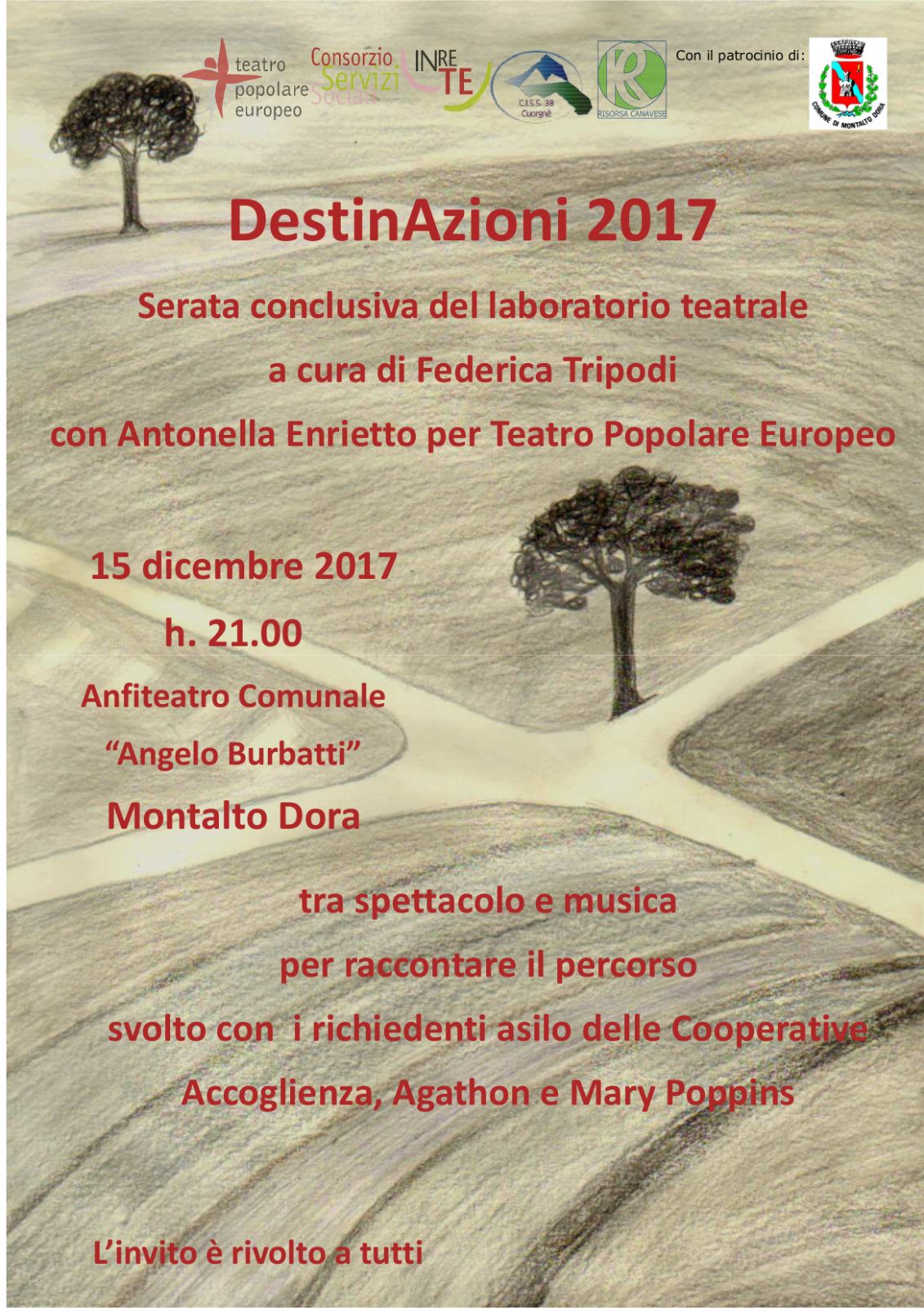 Venerdi 15 Dicembre 2017 all'Anfiteatro Comunale "Angelo Burbatti" di Montalto Dora (ore 21.00) si svolgerà la serata conclusiva del laboratorio di teatro sociale che ha coinvolto 15 ospiti richiedenti asilo dei Centri di Accoglienza Straordinaria C.A.S. di Montalto Dora gestiti dalle Cooperative "L'Accoglienza", "Agathon " e "Mary Poppins".