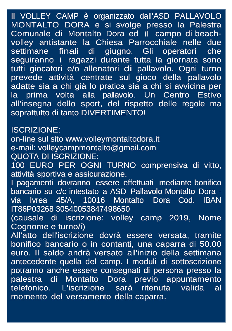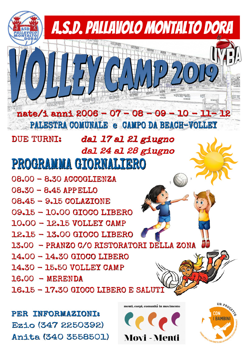 L'A.S.D. Pallavolo Montalto Dora organizza un camp estivo di pallavolo rivolto ai bambini nati dal 2006 al 2012.