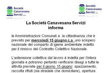 La Società Canavesana Servizi informa che è previsto per Mercoledì 15 Giugno c.a. uno sciopero nazionale del comparto di igiene ambientale indetto per il rinnovo del Contratto Collettivo Nazionale...