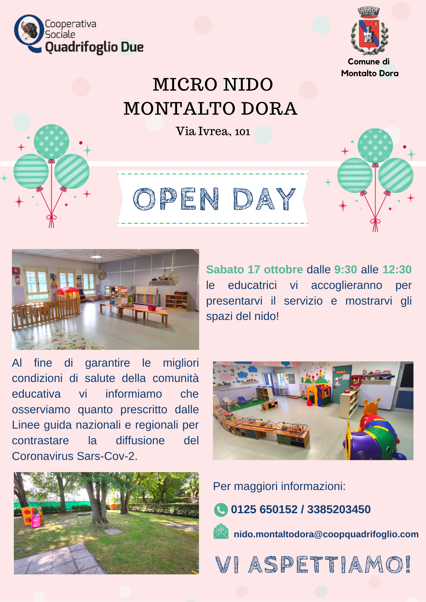 Sabato 17 ottobre 2020, dalle ore 9.30 alle ore 12.30, all'Asilo Nido di Montalto Dora si svolgerà l'Open Day durante il quale le educatrici accoglieranno le famiglie per presentare il servizio educativo e far visitare gli spazi del nido.