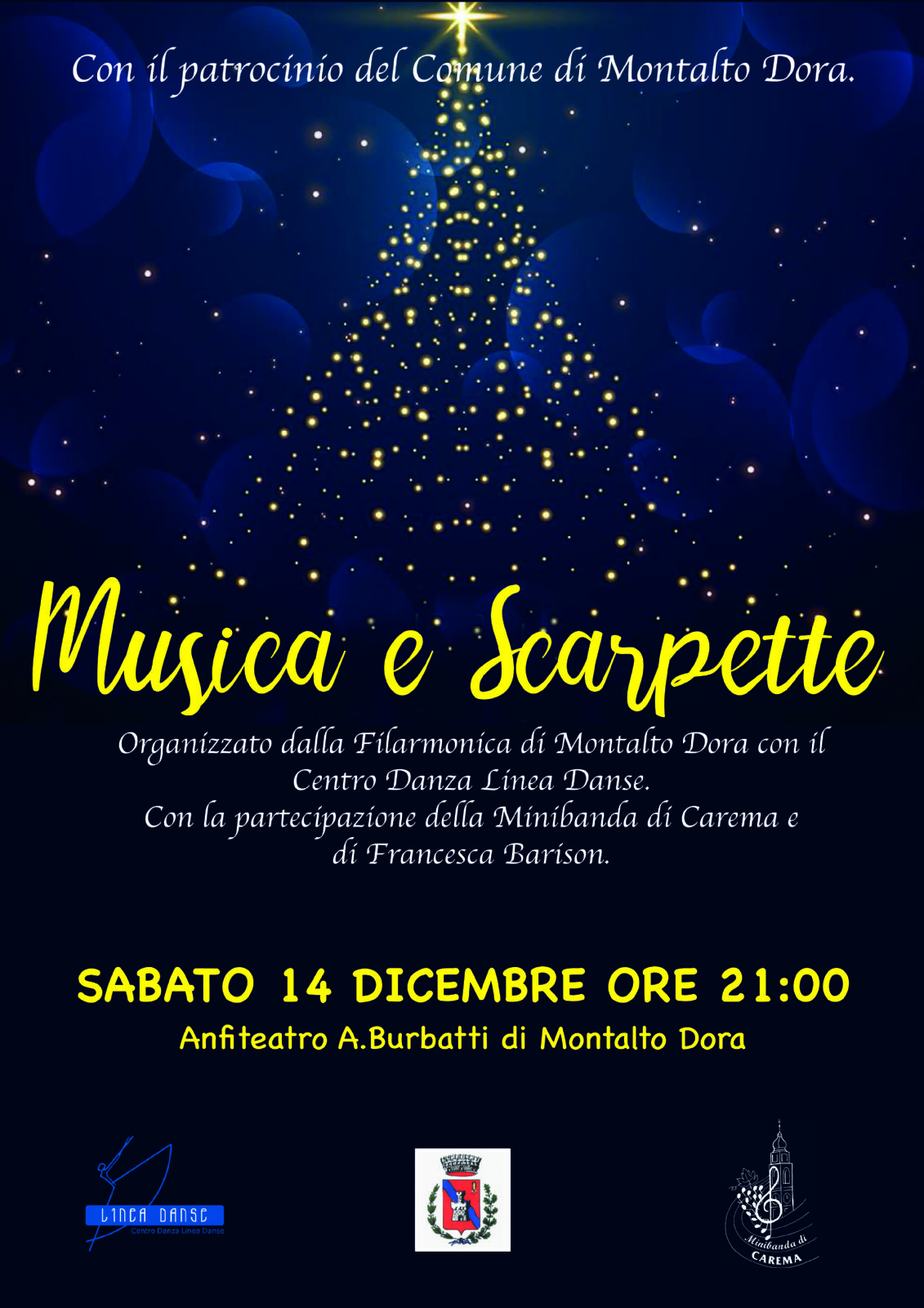 Sabato 14 dicembre 2019 alle ore 21 all'Anfiteatro Comunale "Angelo Burbatti" di Montalto Dora si svolgerà lo spettacolo musicale "Musica e Scarpette" organizzato dalla Filarmonica di Montalto Dora.