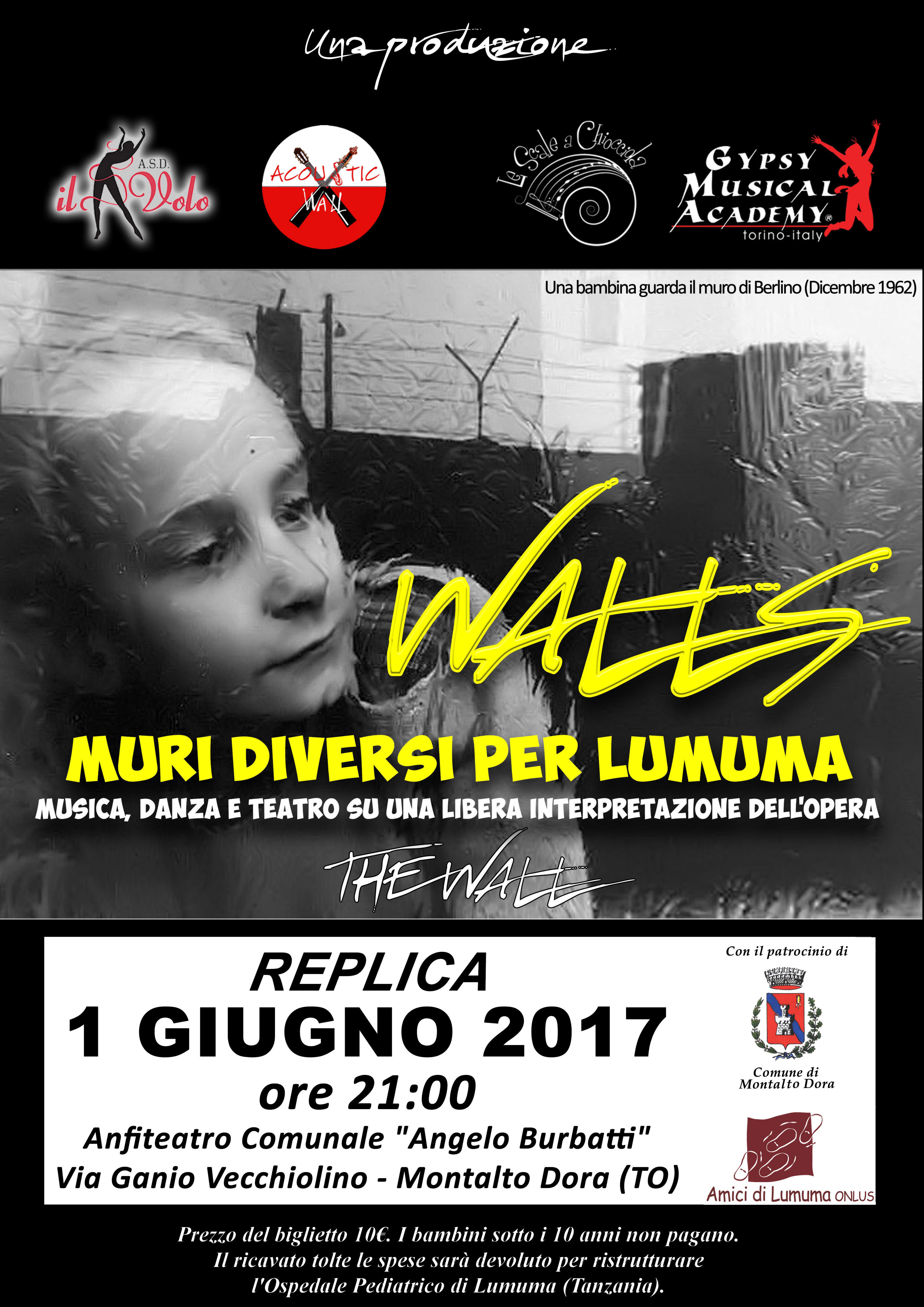 Giovedi 1° giugno 2017 l'Anfiteatro Comunale "Angelo Burbatti" di Montalto Dora (ore 21.00) ospiterà lo spettacolo "Walls. Muri diversi per Lumuma", una serata di musica, danza e teatro a partire da una libera interpretazione dell’opera The Wall.